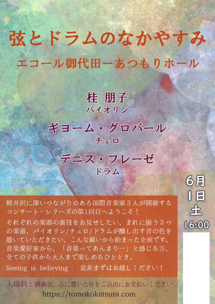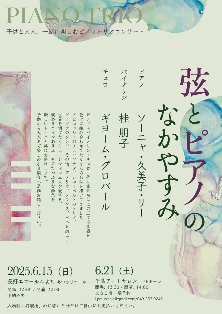 朋子:「はい。6/15(日)には長野県の御代田の『長野エコールみよた あつもりホール』で。その次は6/21(土)千葉市中央区の『千葉アートサロン 2階』で行います。私とギヨームのバイオリン・チェロ以外に、ピアノ(ソーニャ・久美子・リー)が加わりトリオ編成になります。ピアノが入ると格段に音の幅が広がって、今からとても楽しみなんです」。